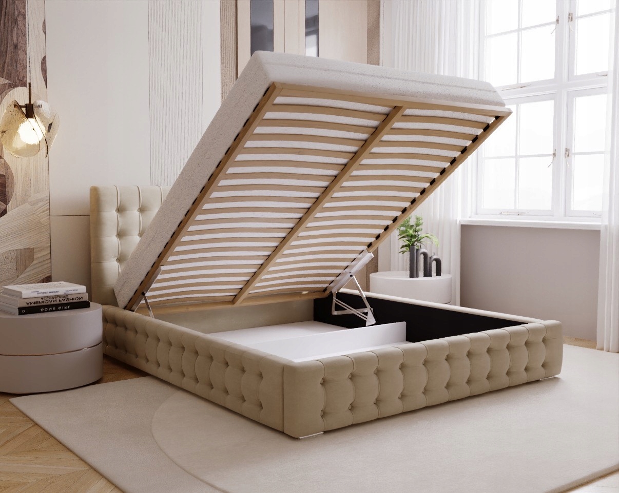 Im Lieferumfang enthalten sind ein praktischer Bettkasten sowie ein Holzlattenrost, die eine optimale Unterstützung der Matratze und gute Belüftung gewährleisten. Optional kann ein Metalllattenrost mit Gasdruckfedern bestellt werden, um noch mehr Komfort und Stabilität zu bieten. Das Polsterbett 160x200 Palmo ist die perfekte Wahl für alle, die Stil, Funktionalität und hochwertige Verarbeitung schätzen. Das gepolsterte Schlafzimmerbett Palmo passt ideal zu modernen und klassischen Einrichtungsstilen und schafft eine gemütliche und stilvolle Schlafumgebung.