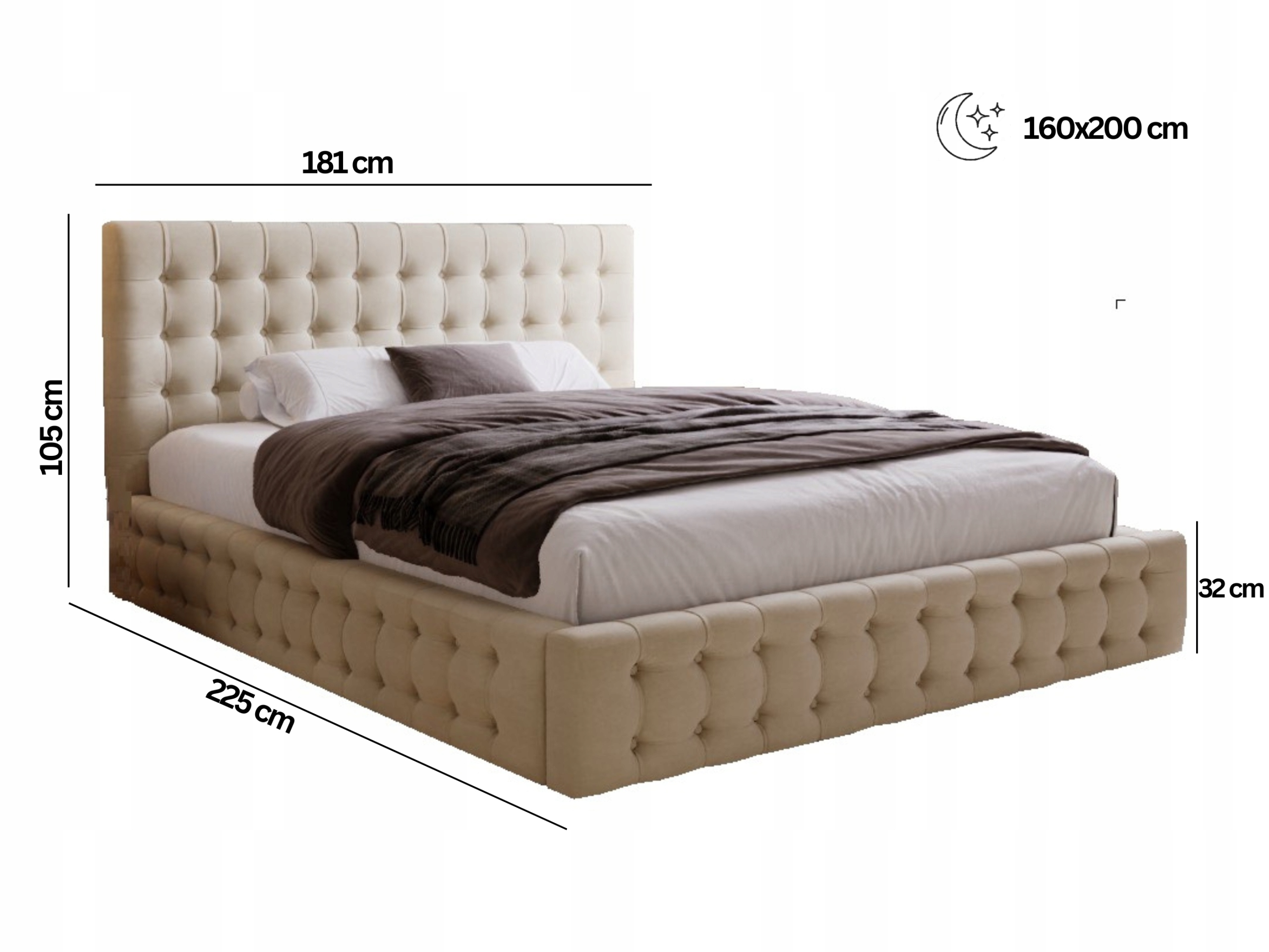 Das Polsterbett Palmo 160x200 verbindet modernen Stil mit klassischer Eleganz und verleiht jedem Schlafzimmer eine besondere Atmosphäre. Charakteristisch sind die handgefertigten Steppungen mit Knöpfen, die dem Bett ein edles und stilvolles Aussehen verleihen. Die stabile Konstruktion, gepolstert mit weichem, angenehmem Stoff, sorgt für höchsten Schlafkomfort.