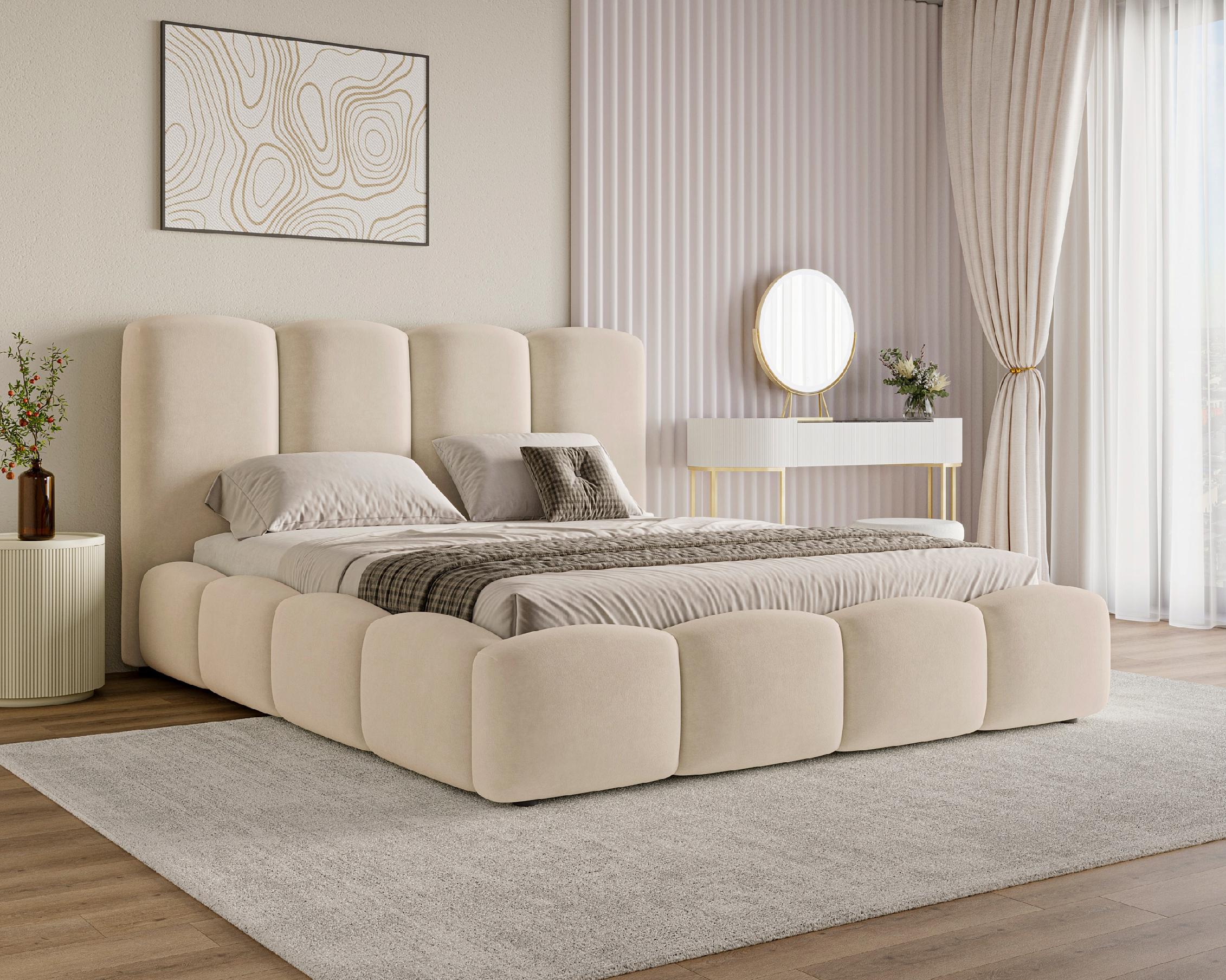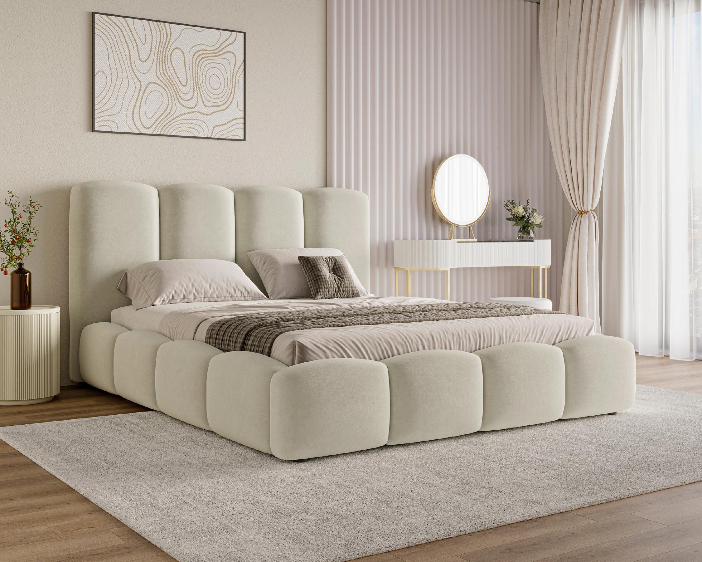 Im Set enthalten ist ein praktischer Bettkasten für Bettwäsche sowie ein stabiler, hölzerner Lattenrost, der eine optimale Unterstützung für die Matratze gewährleistet. Für noch mehr Komfort besteht die Möglichkeit, einen Metall-Lattenrost mit Gasdruckfeder zusätzlich zu erwerben. Das Polsterbett 120x200 Puffy ist die ideale Wahl für Schlafzimmer im minimalistischen, skandinavischen oder Modern-Soft-Stil. Sein außergewöhnliches Design macht es zu einem zentralen Blickfang in jedem Raum.