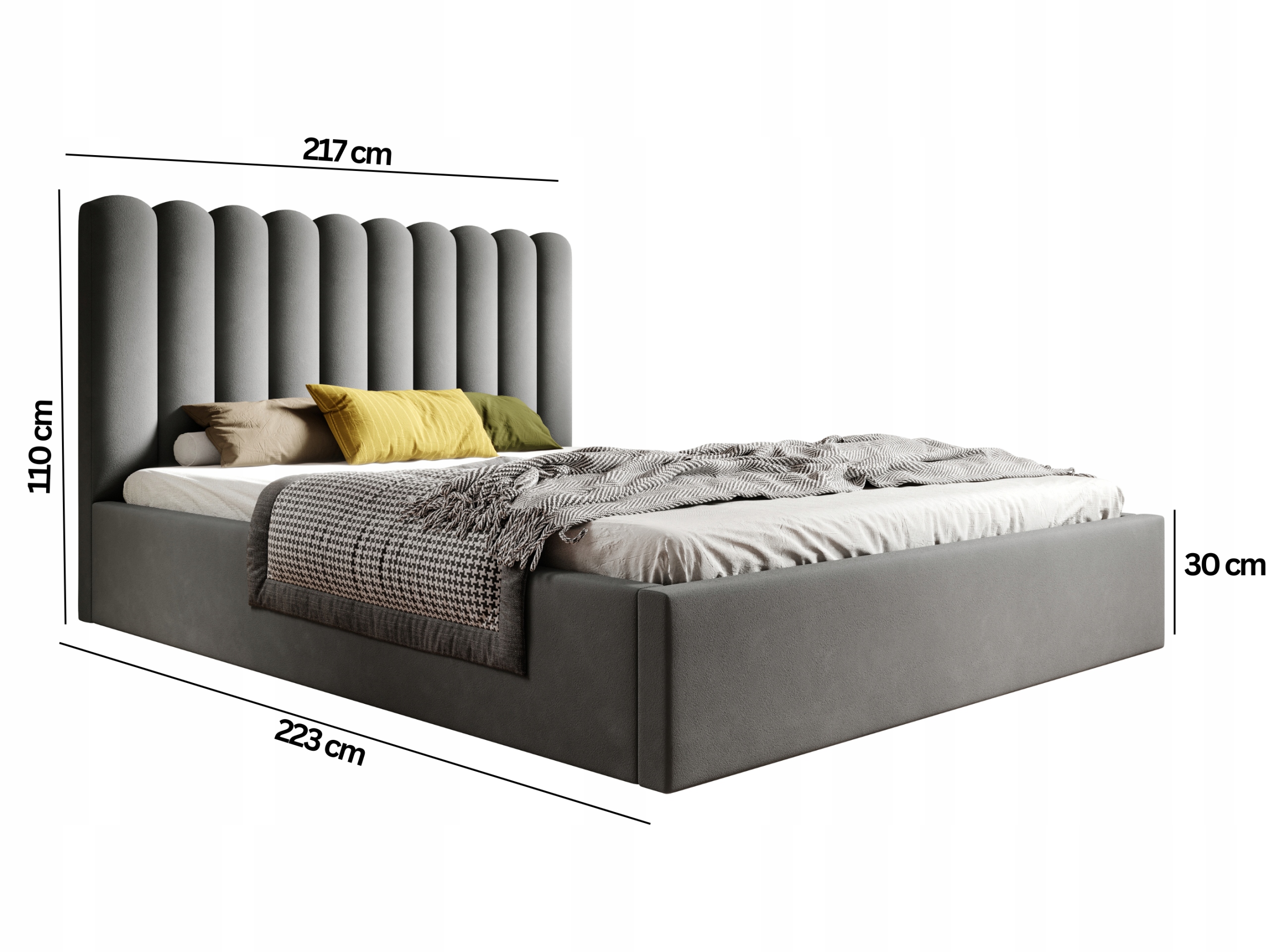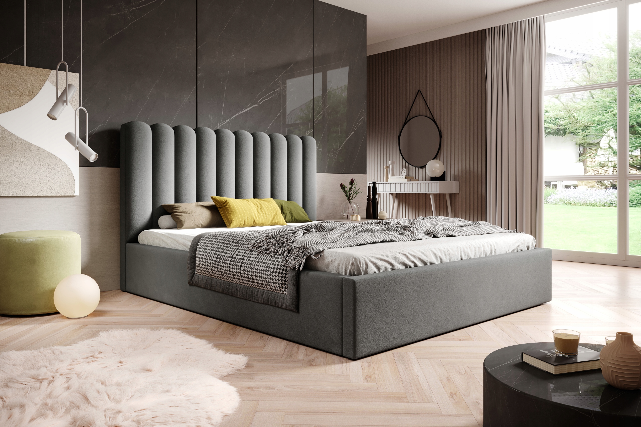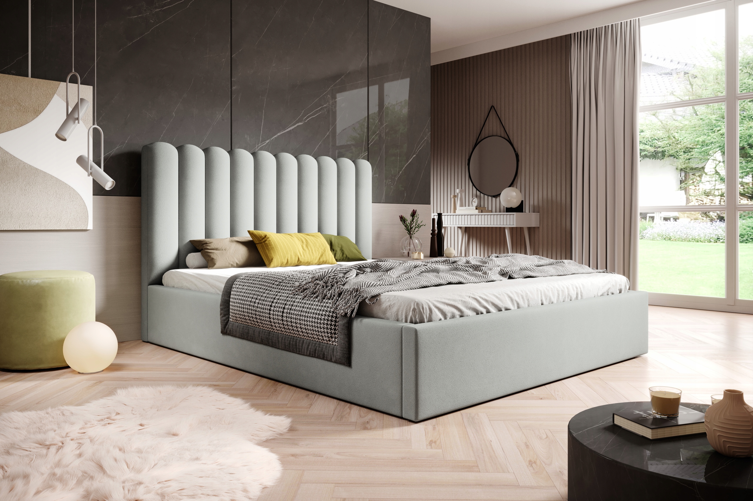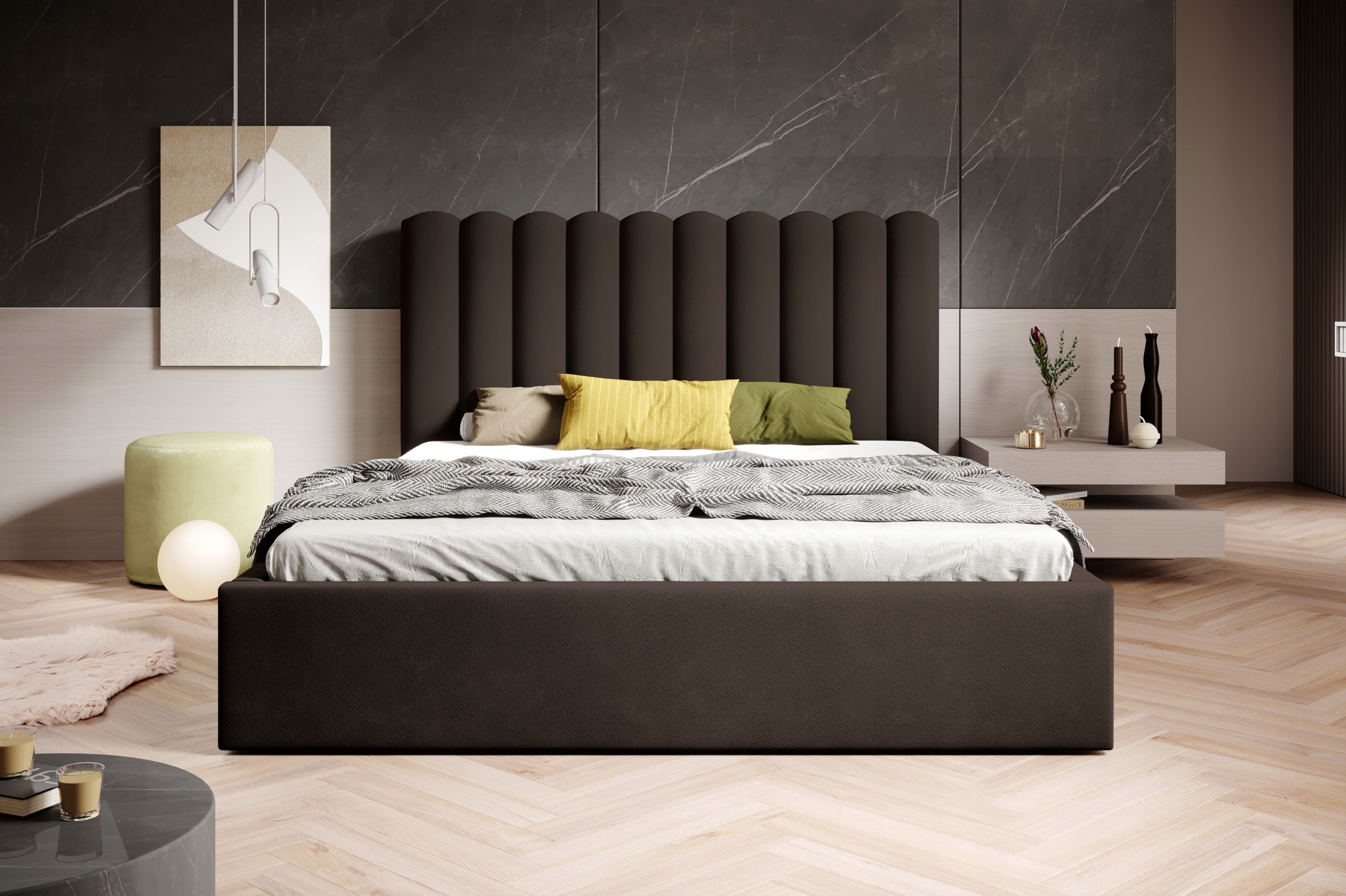 Polsterbett Lumi 200x200 ist ein stilvolles und funktionales Modell, ideal für jedes Schlafzimmer. Auf niedrigen Füßen platziert, was ihm ein modernes und dezentes Aussehen verleiht. Es verfügt über einen praktischen Bettkasten, der das Aufbewahren von Decken und Kissen ermöglicht und zusätzlichen Stauraum schafft. Das Doppelbett ist standardmäßig mit einem stabilen Holzlattenrost ausgestattet, der eine zuverlässige Unterstützung für die Matratze bietet. Das besondere Kopfteil besteht aus dekorativen Halbrollen, die dem Bett einen originellen Charakter und Eleganz verleihen. Eine Kombination aus modernem Design und Komfort, die sich perfekt für verschiedene Einrichtungsstile eignet.