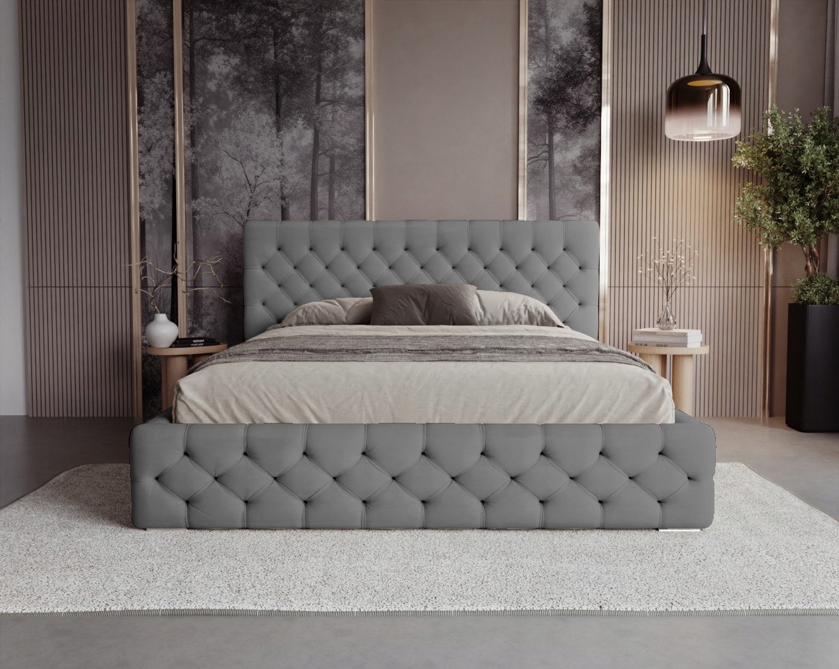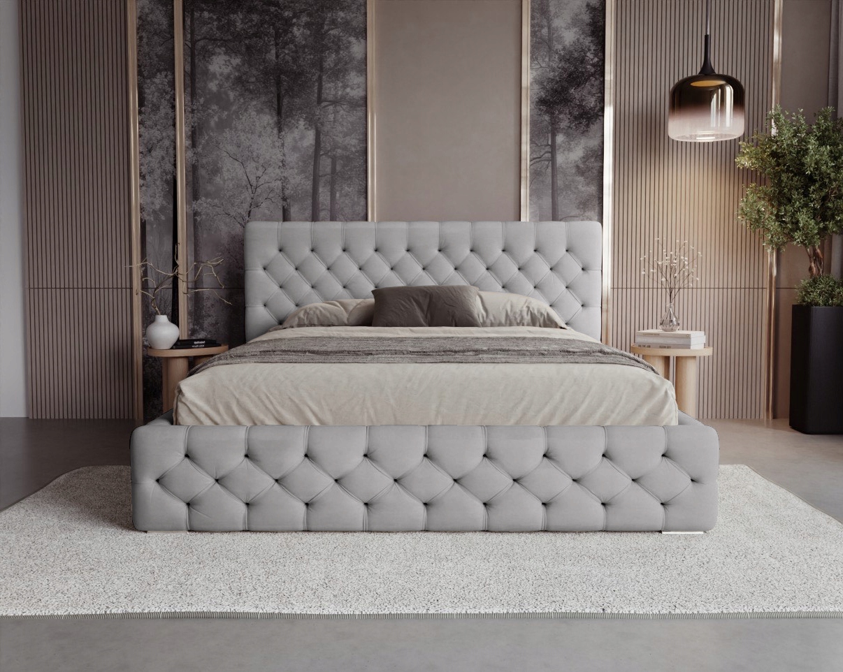 Das Chesterfield Bett ist ein außergewöhnliches Möbelstück, das durch seine tiefen, handgefertigten Steppungen mit stoffbezogenen Knöpfen sofort ins Auge fällt. Das elegante Muster erstreckt sich über die gesamte Bettumrandung und das Kopfteil und verleiht dem Bett einen besonders stilvollen Charakter. Die solide Konstruktion, gepolstert mit weichem Veloursstoff, sorgt nicht nur für Langlebigkeit, sondern auch für einen hohen Nutzungskomfort.