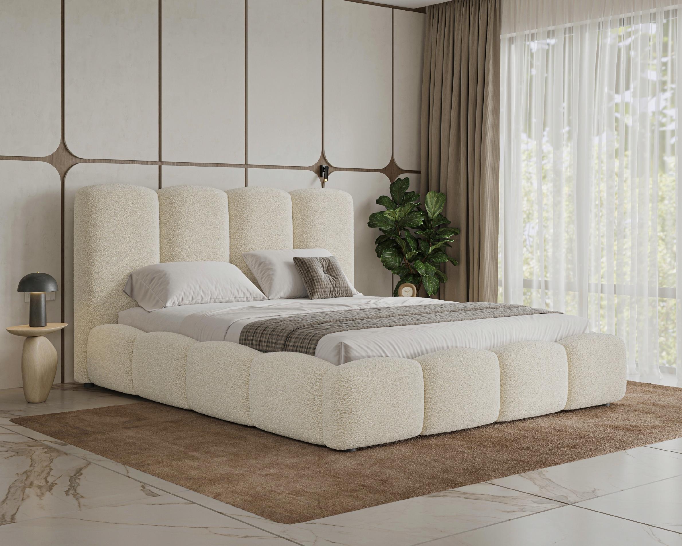 Das Bett ist mit Bouclé-Stoff – weicher Teddy-Stoff bezogen, der sich besonders angenehm anfühlt und perfekt zu modernen Wohnräumen passt. Die dicke, weiche Polsterung auf der gesamten Konstruktion sorgt für hohen Komfort im Alltag und eine angenehme Erholung.