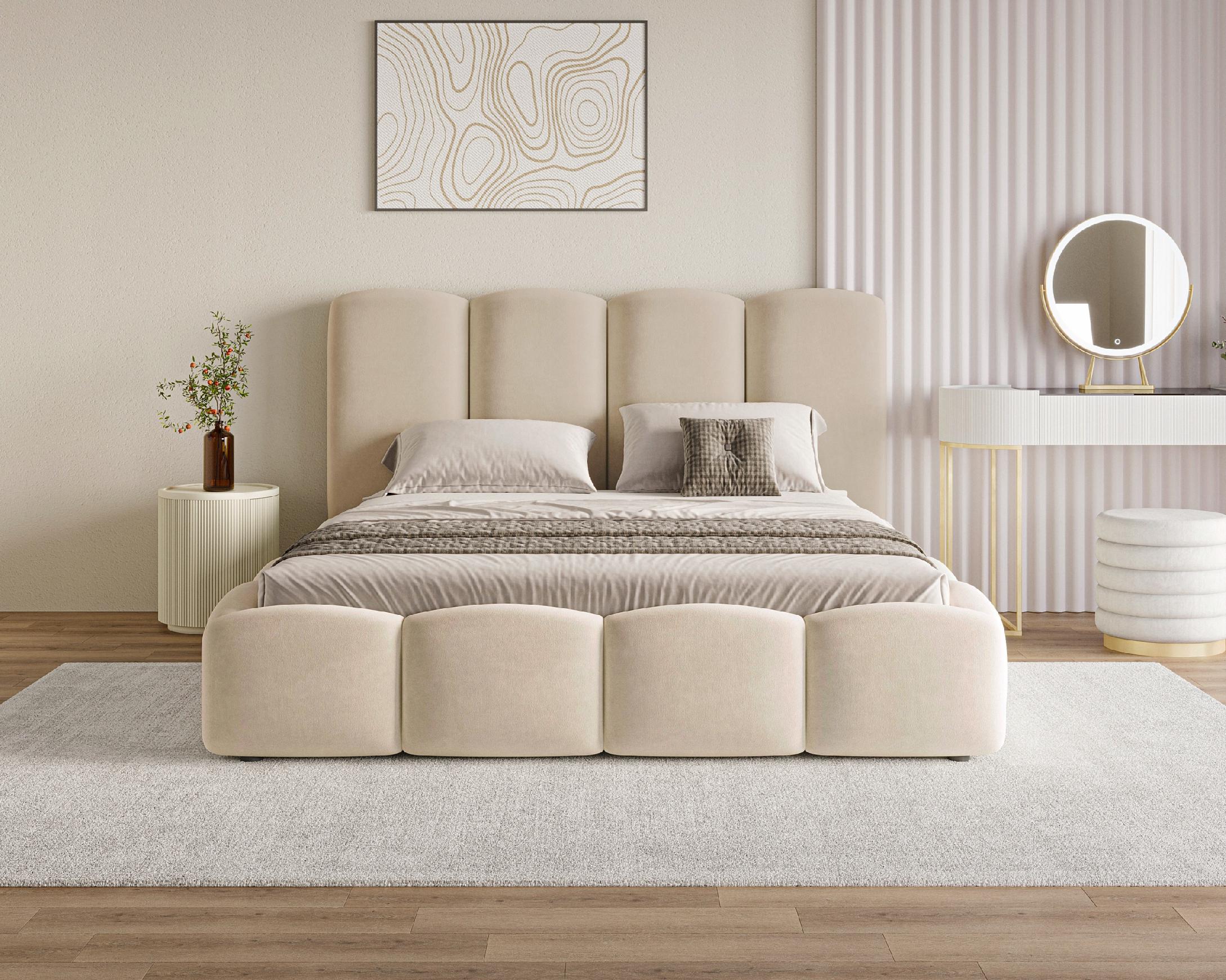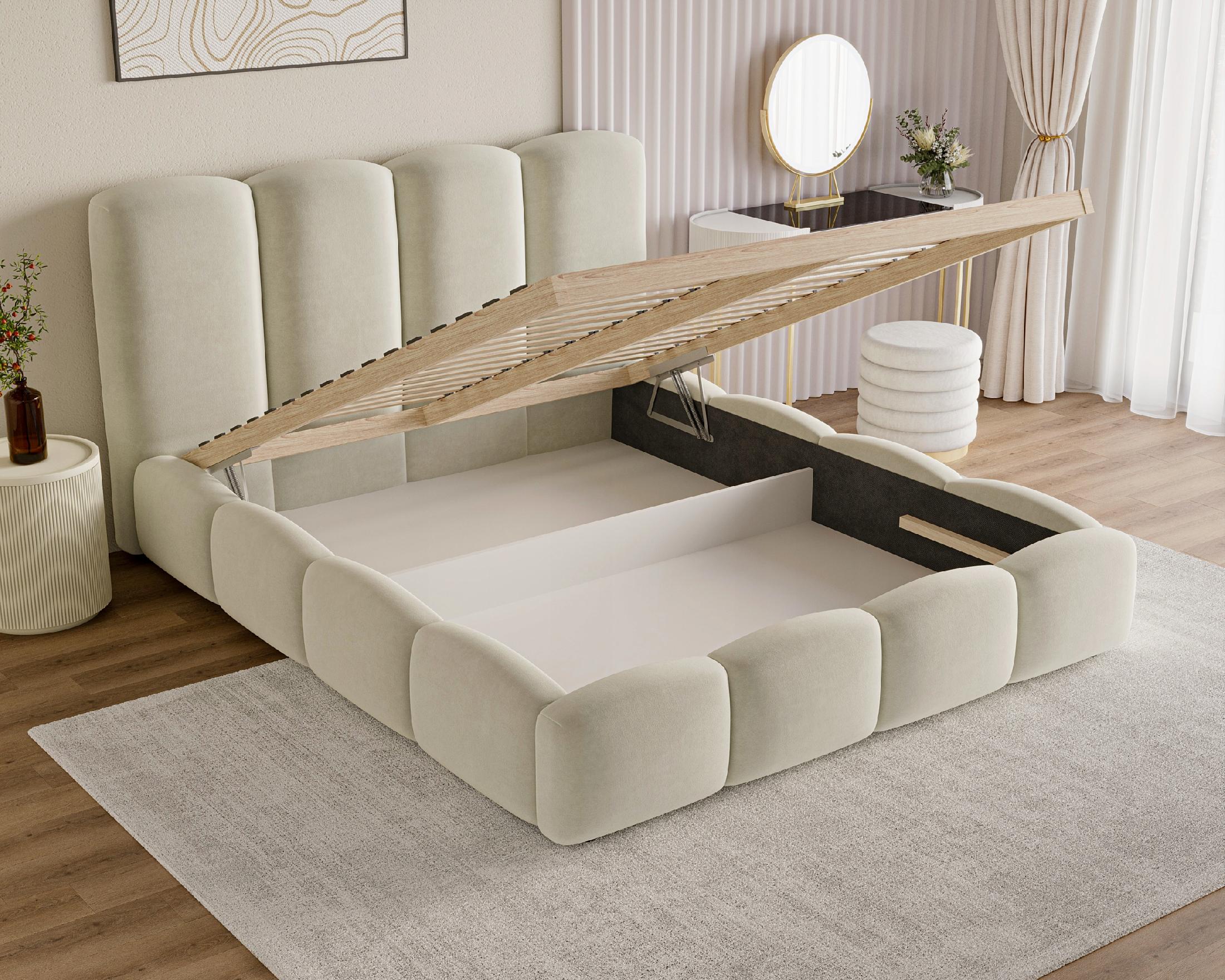 Im Set enthalten ist ein praktischer Bettkasten für Bettwäsche sowie ein stabiler, hölzerner Lattenrost, der eine optimale Unterstützung für die Matratze gewährleistet. Für noch mehr Komfort besteht die Möglichkeit, einen Metall-Lattenrost mit Gasdruckfeder zusätzlich zu erwerben. Das Polsterbett 160x200 Puffy ist die ideale Wahl für Schlafzimmer im minimalistischen, skandinavischen oder Modern-Soft-Stil. Sein außergewöhnliches Design macht es zu einem zentralen Blickfang in jedem Raum.