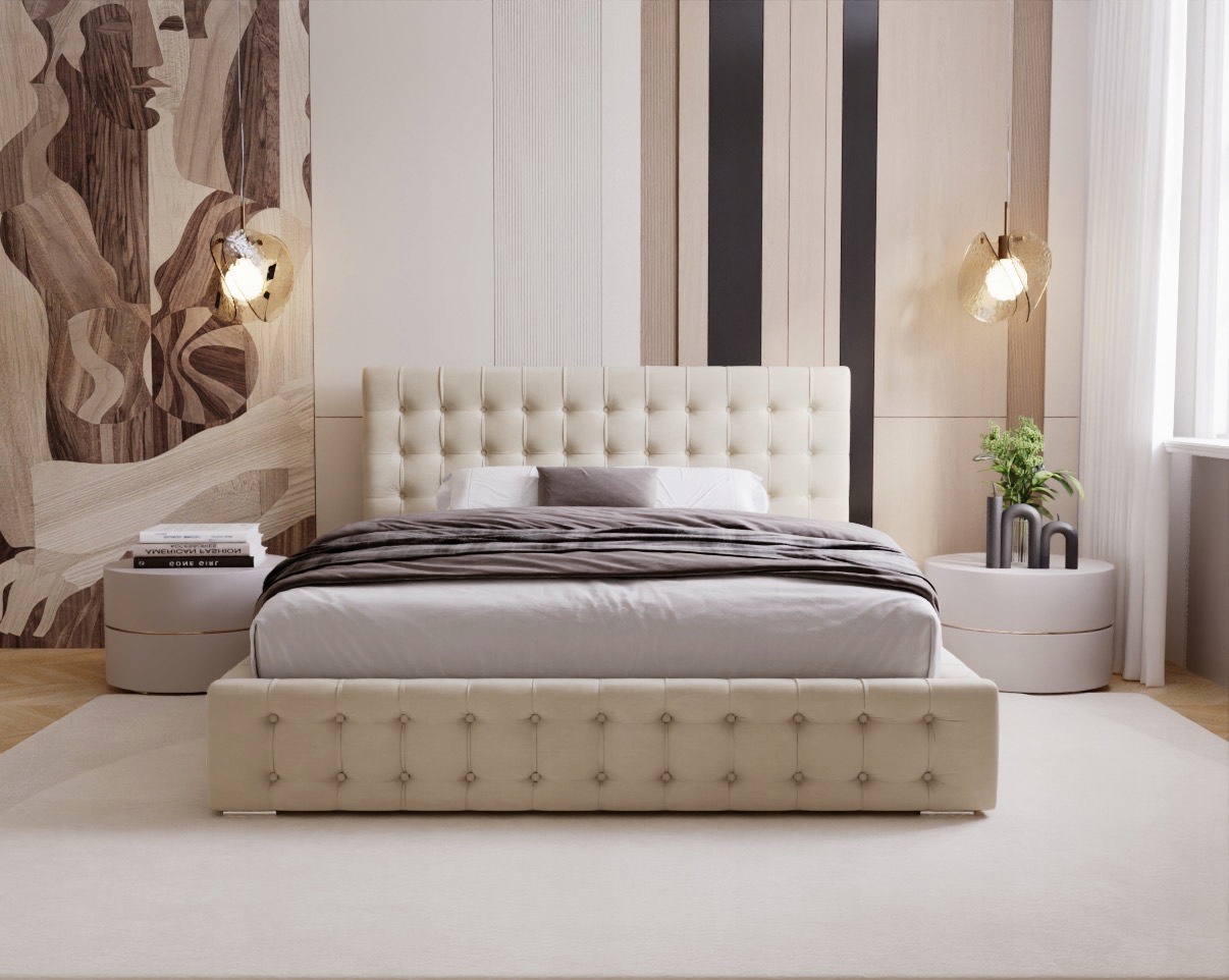 Im Lieferumfang enthalten ist ein Stauraum für Bettwäsche sowie ein Holzlattenrost, der eine stabile Unterstützung der Matratze und optimale Belüftung gewährleistet. Zusätzlich besteht die Möglichkeit, einen Metall-Lattenrost mit Gasdruckheber für noch mehr Komfort und Langlebigkeit dazuzubestellen. Polsterbett 200x200 ist die perfekte Wahl für alle, die Eleganz, Funktionalität und hochwertige Verarbeitung schätzen. Gepolstertes Bett für das Schlafzimmer Palmo passt sowohl zu klassischen als auch modernen Einrichtungsstilen und schafft eine gemütliche und stilvolle Rückzugszone.
