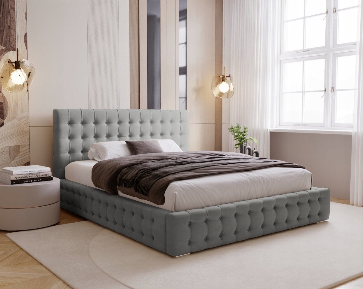 Das Palmo Bett ist eine Kombination aus modernem Stil und klassischer Eleganz, die jedes Schlafzimmer verwandelt. Charakteristisches Merkmal dieses Modells sind handgefertigte Steppungen mit Knöpfen, die dem Bett einen einzigartigen Charme und einen anspruchsvollen Charakter verleihen. Die solide Konstruktion, gepolstert mit einem weichen, angenehmen Stoff, garantiert höchsten Komfort.